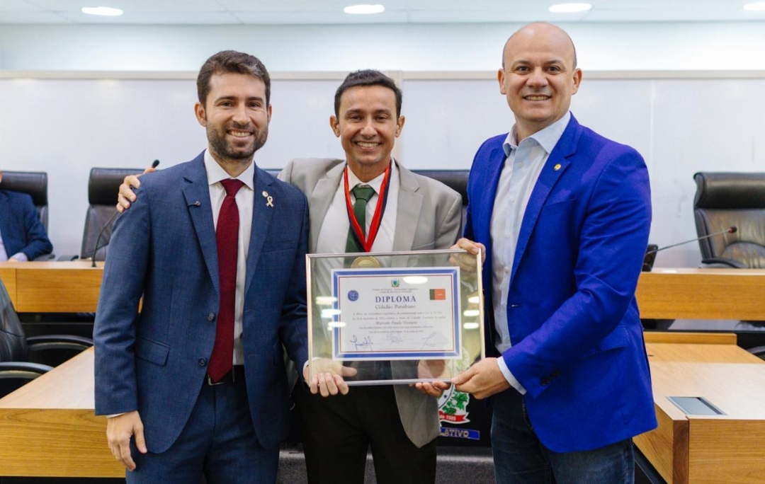 A Assembleia Legislativa da Paraíba realizou, nesta sexta-feira (14), sessão solene para a entrega do Título de Cidadão Paraibano e da Medalha Epitácio Pessoa ao médico Marcelo Paulo Tissiani, em reconhecimento aos relevantes serviços prestados ao estado. O Título foi proposto pelo ex-deputado estadual Cabo Gilberto, agora deputado federal, enquanto a Medalha partiu de iniciativa do deputado Michel Henrique. A sessão solene aconteceu no Plenário da Casa e contou com a presença dos parlamentares autores das homenagens, além de médicos, familiares e amigos do homenageado.