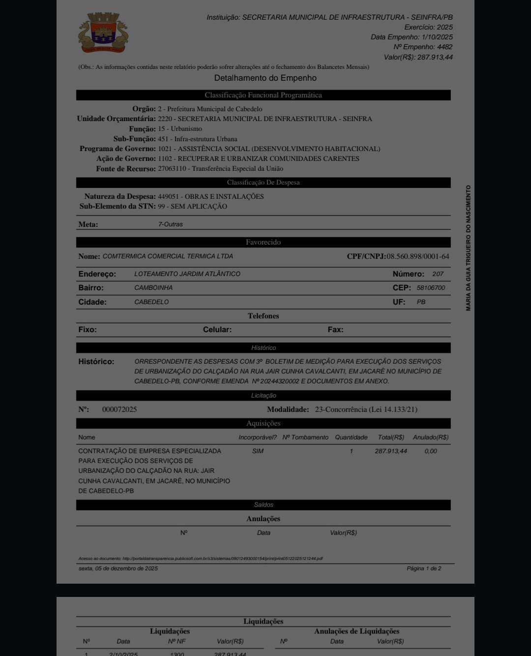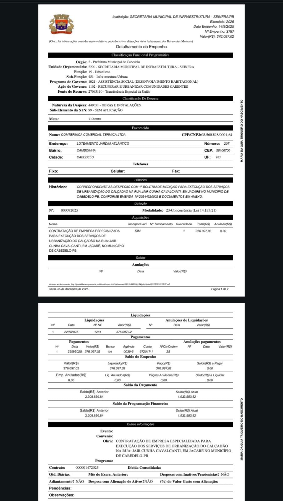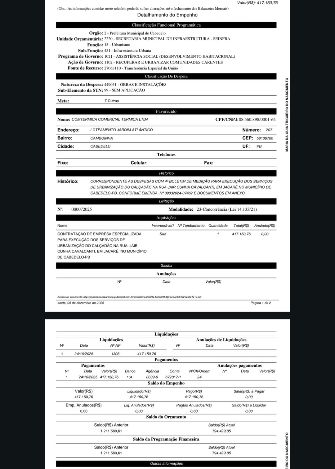 Mais uma obra da gestão do ex-prefeito André Coutinho, em Cabedelo, pode estar apresentando indícios de irregularidade. Moradores afirmam que o calçadão contratado junto à construtora Cotermica, avaliado em R$ 2.258.000,00, não teria sequer avançado 400 metros, apesar de já ter sido empenhado aproximadamente R$ 1.702.000,00, conforme documentos anexos.