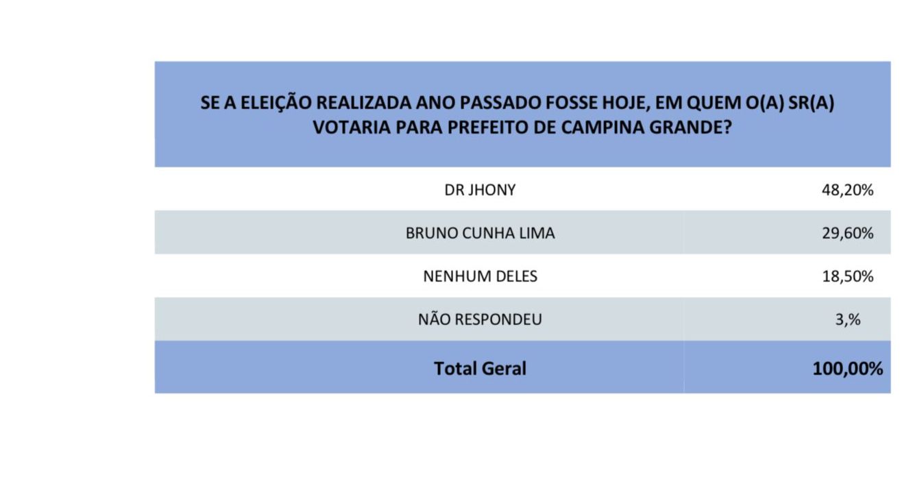 Segundo o levantamento, Jhony aparece com 48,20% das intenções de voto, enquanto Bruno Cunha Lima marca apenas 29,60%. Outros 18,50% declararam que não votariam em nenhum dos dois, e 3% preferiram não responder.
