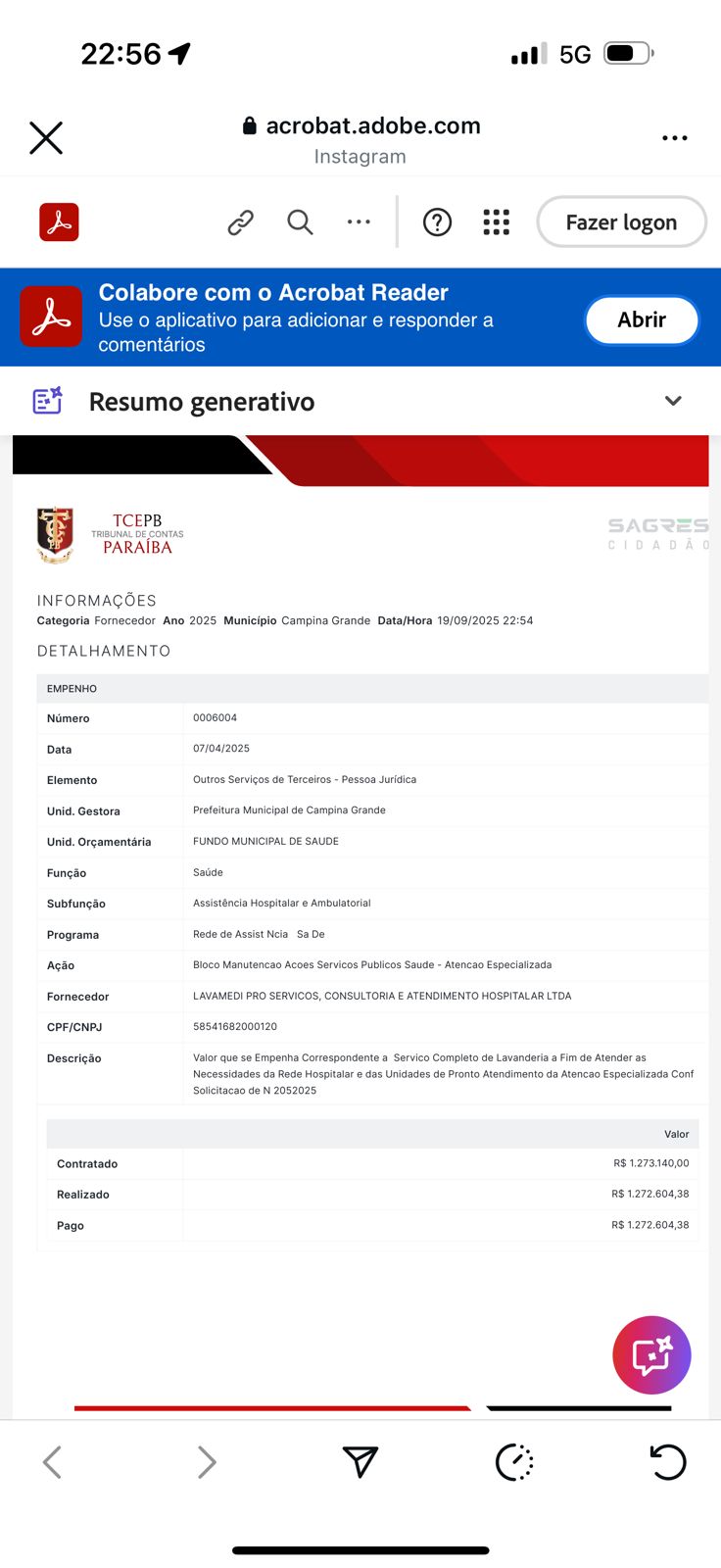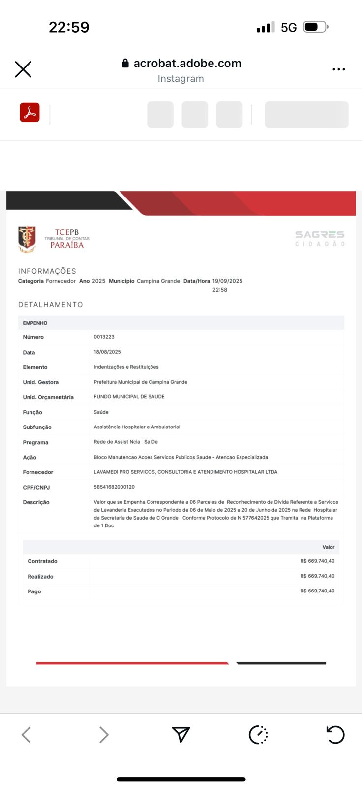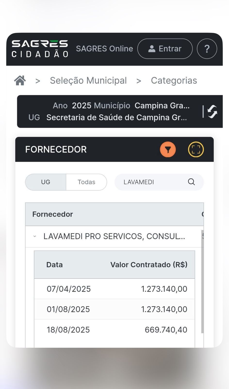 Documentos do Tribunal de Contas do Estado da Paraíba (TCE-PB), disponíveis no SAGRES, mostram que a Prefeitura de Campina Grande, por meio do Fundo Municipal de Saúde, empenhou e pagou três contratos milionários à LAVAMEDI logo nos primeiros meses de 2025:
