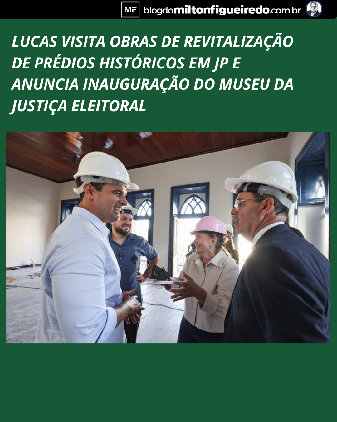 "O governador em exercício Lucas Ribeiro inspecionou, na tarde desta sexta-feira (27), uma série de obras de revitalização no Centro Histórico de João Pessoa e anunciou para a próxima sexta-feira (6 de março), às 16h, a inauguração do Museu da Justiça Eleitoral – Memorial da Democracia, que está sendo construído com investimento de mais de R$ 3 milhões numa parceria entre o Estado e Tribunal Regional Eleitoral (TRE).