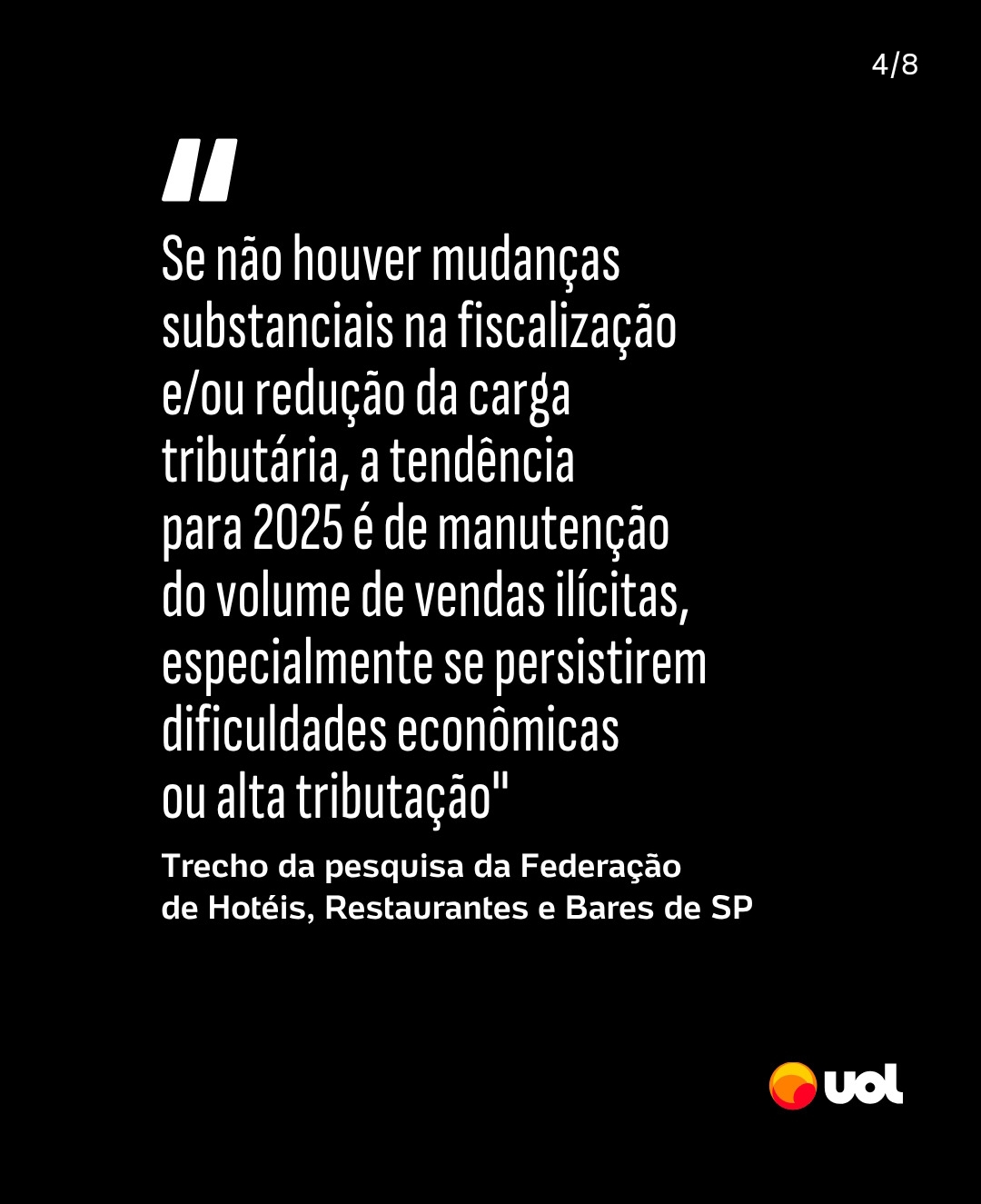 A pesquisa defende que a situação não deve melhorar em 2025, cobrando "mudanças substanciais na fiscalização e/ou redução da carga tributária do setor"."