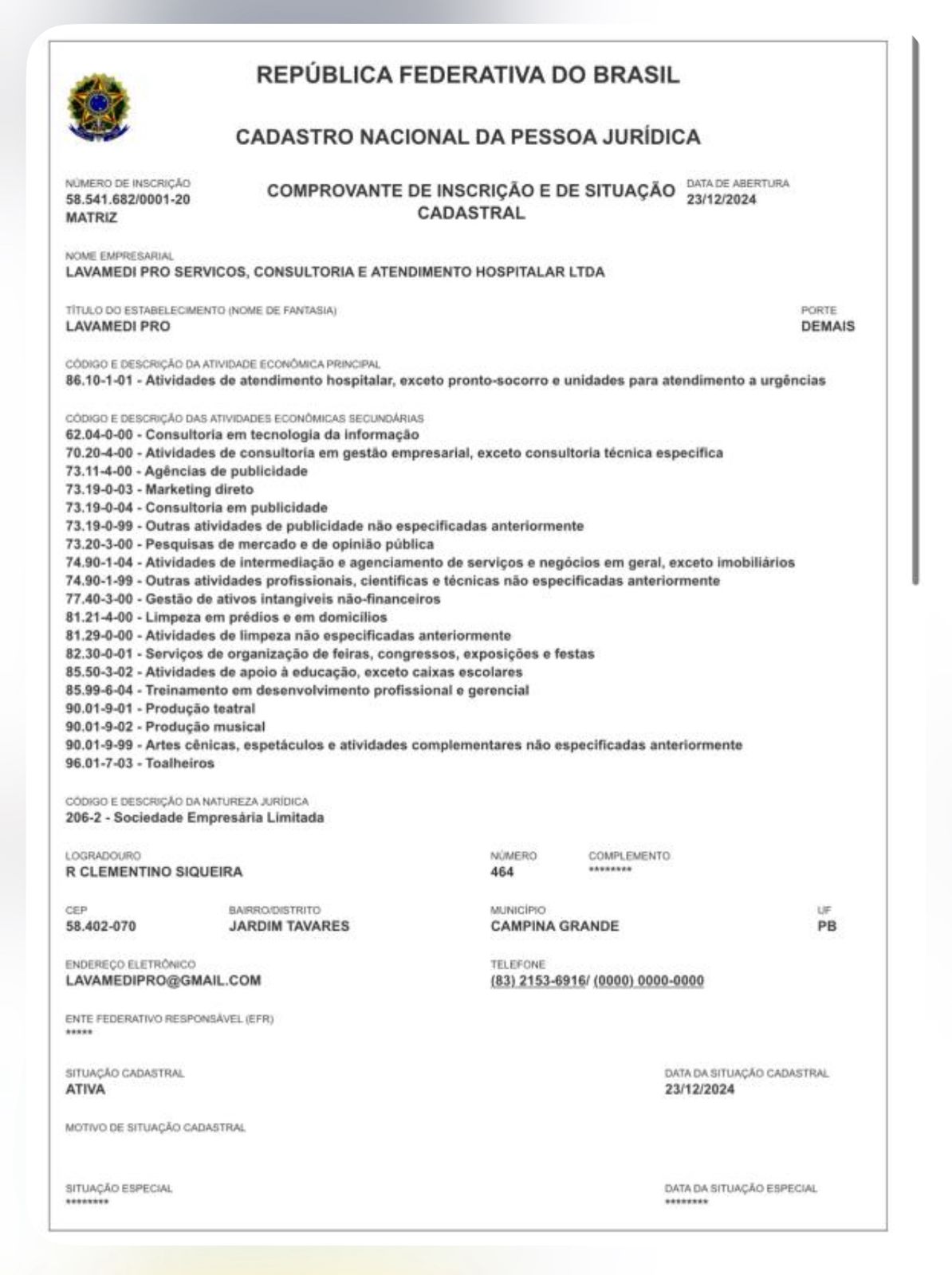 Além de serviços hospitalares e lavanderia, o CNPJ nº 58.541.682/0001-20 revela que a empresa atua — ao menos no papel — em uma incrível variedade de áreas, entre elas: