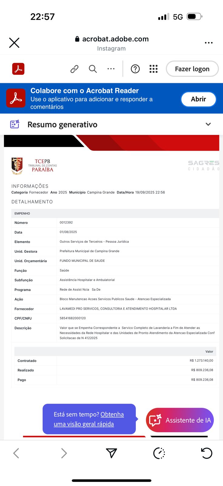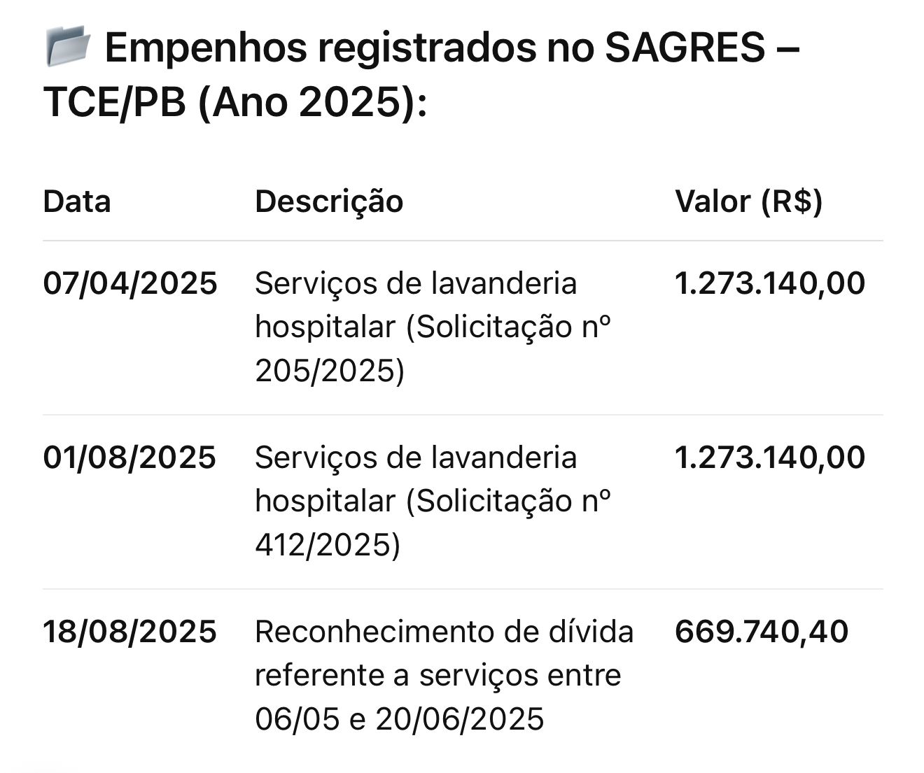 Segundo informações disponíveis no SAGRES do Tribunal de Contas do Estado da Paraíba (TCE-PB), a Prefeitura de Campina Grande, através do Fundo Municipal de Saúde, firmou três empenhos milionários com a empresa recém-criada.