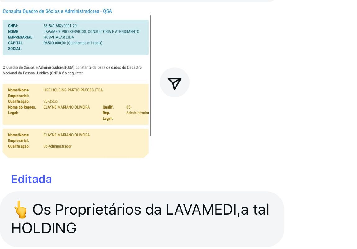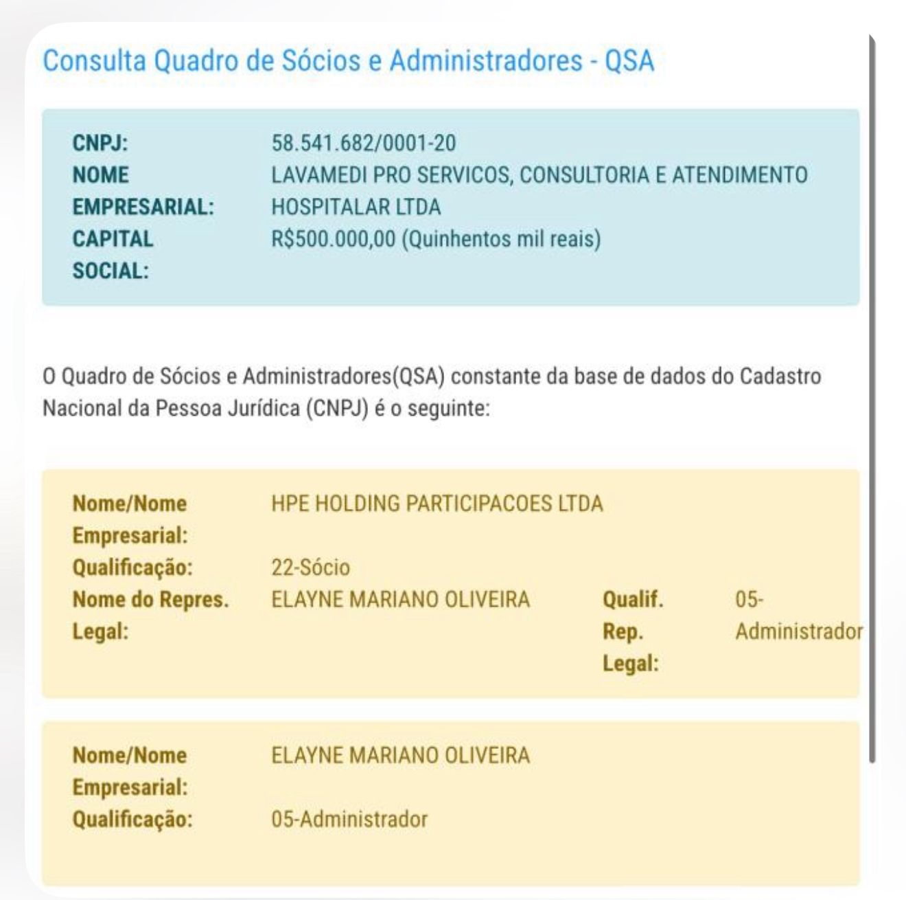 O capital social declarado da LAVAMEDI é de R$ 500.000,00, tendo como administradora e representante legal Elayne Mariano Oliveira, que aparece também como responsável pela holding.
