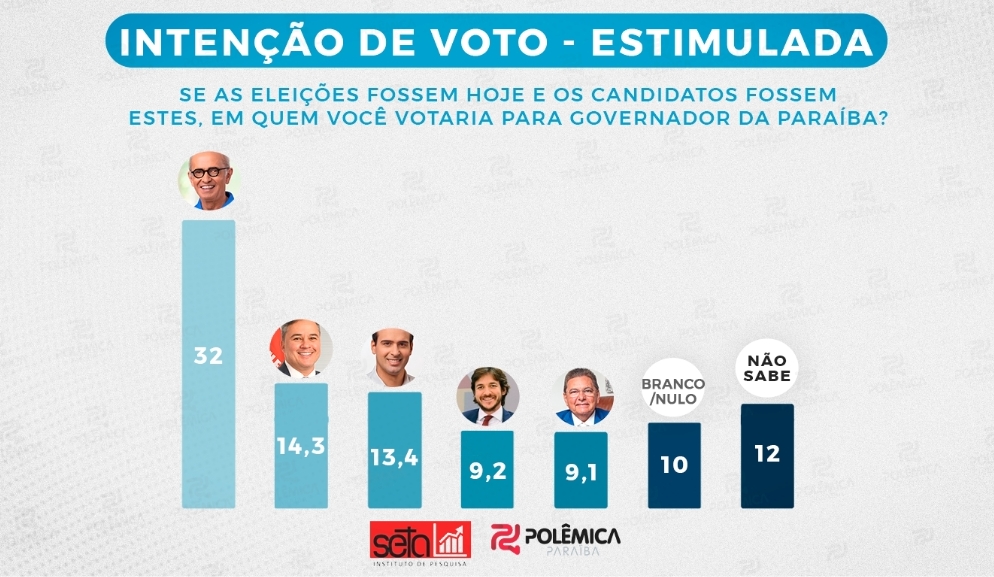 No cenário estimulado, Cícero aparece com 32% das intenções de voto, mantendo ampla vantagem sobre os adversários. O senador Efraim Filho (União Brasil), que vinha atrás do ex-deputado federal Pedro Cunha Lima (PSD) na pesquisa anterior, agora ultrapassa o ex-candidato ao governo e aparece em segundo lugar, com 14,3%.