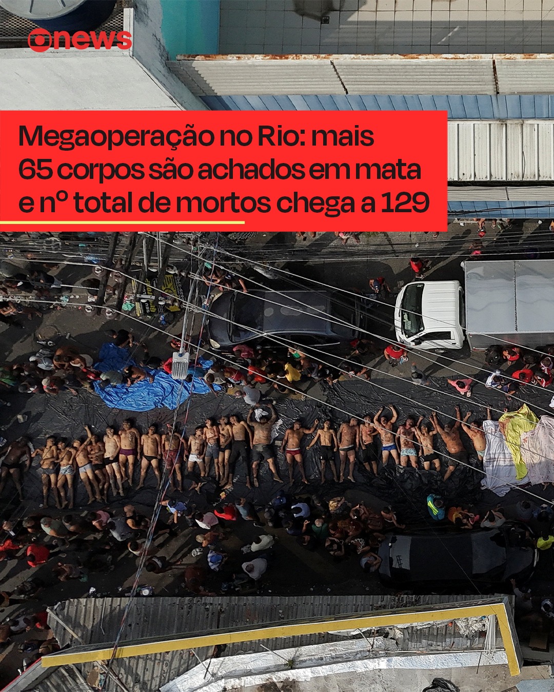 "VIOLÊNCIA - Moradores do Complexo da Penha, na Zona Norte do Rio de Janeiro, levaram pelo menos 65 corpos para a Praça São Lucas, na Estrada José Rucas, uma das principais da região, ao longo da madrugada desta quarta-feira (29), o dia seguinte à operação mais letal da história do RJ. Desde terça (28), já são 129 mortes.