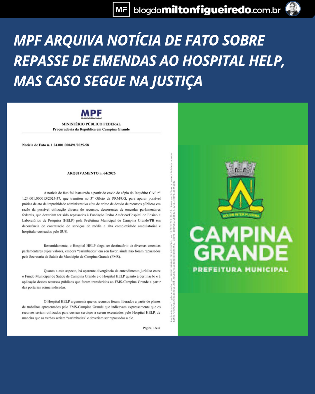 O Ministério Público Federal (MPF) decidiu arquivar a Notícia de Fato nº 1.24.001.000491/2025-58, que apurava possível prática de improbidade administrativa ou crime relacionado ao repasse de recursos de emendas parlamentares destinadas ao Hospital de Ensino e Laboratórios de Pesquisa (HELP), em Campina Grande.