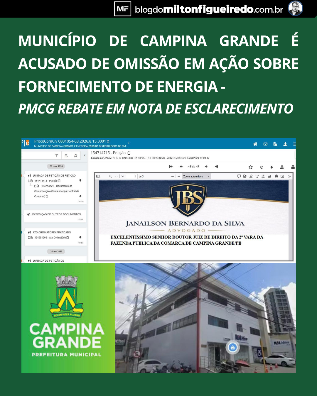 Um novo desdobramento jurídico pode alterar o rumo de uma ação que tramita na 2ª Vara da Fazenda Pública da Comarca de Campina Grande. O advogado Janailson Bernardo da Silva (OAB/PB 29.747) protocolou manifestação apontando a existência de fato superveniente que, segundo ele, contradiz a narrativa apresentada inicialmente pelo Município de Campina Grande em processo envolvendo o fornecimento de energia elétrica em um imóvel público localizado na Rua Irineu Joffily, nº 304.