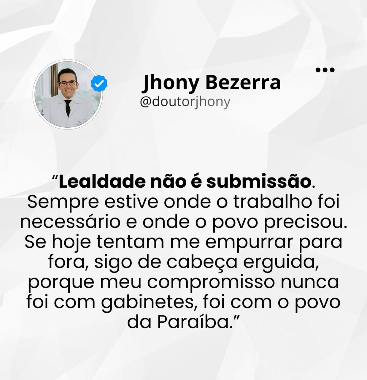 Nova realidade: em postagem nas redes sociais, Jhony Bezerra já deixa claro que praticamente deixou o grupo de João Azevêdo.