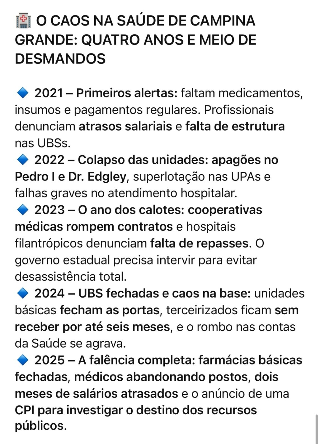 Na área da Saúde, o Tribunal de Contas do Estado da Paraíba (TCE-PB) já apontou irregularidades em contratos, ausência de transparência nos gastos e falhas na execução orçamentária. O quadro é agravado por salários atrasados, unidades básicas fechadas e falta de medicamentos essenciais.