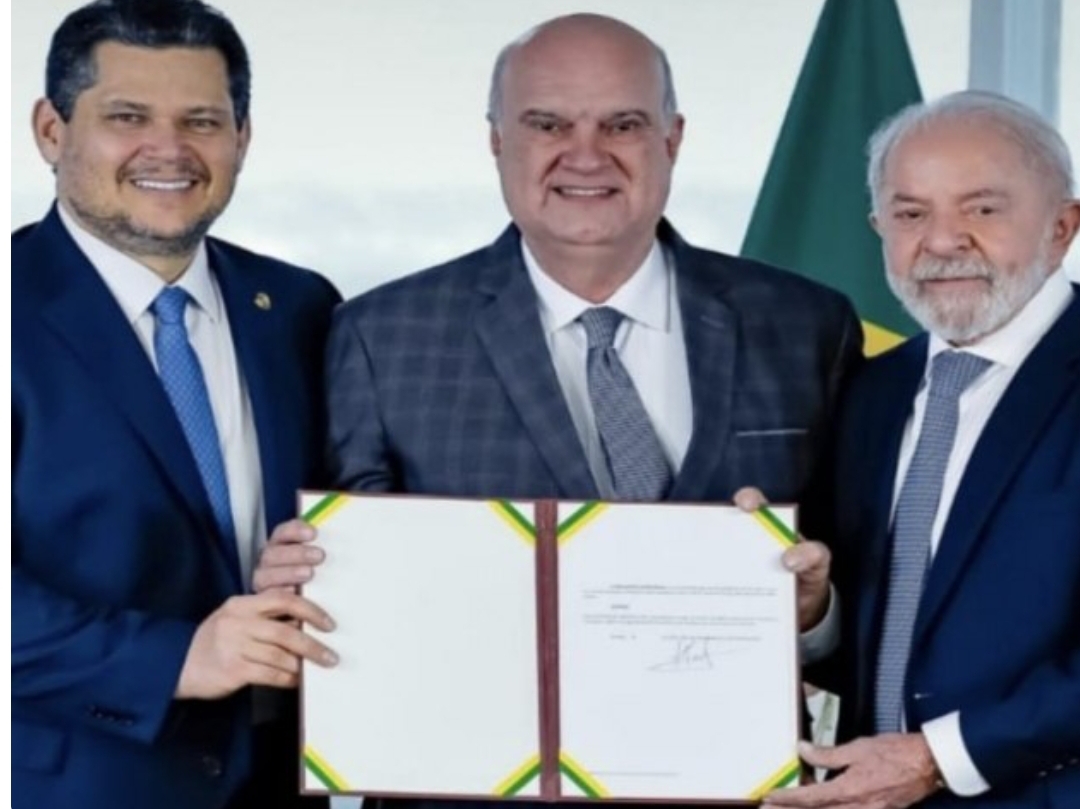 Alex Azevedo entre o presidente do Senado, Davi Alcolumbre e o presidente Lula.