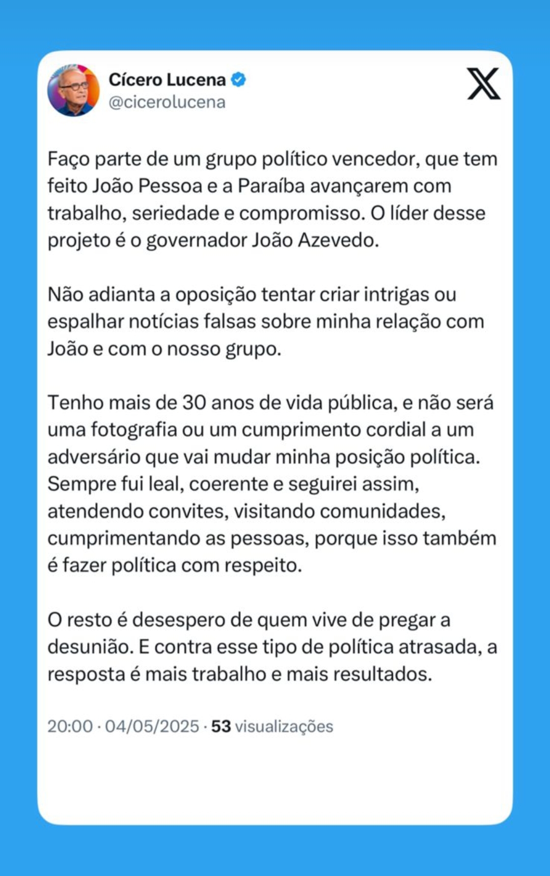 Rapidinhas do MF: Cícero Lucena abre o verbo na rede social e mostra que a oposição não tem, nem mesmo, um nome que possa, sequer, disputar com o grupo de João Azevedo.