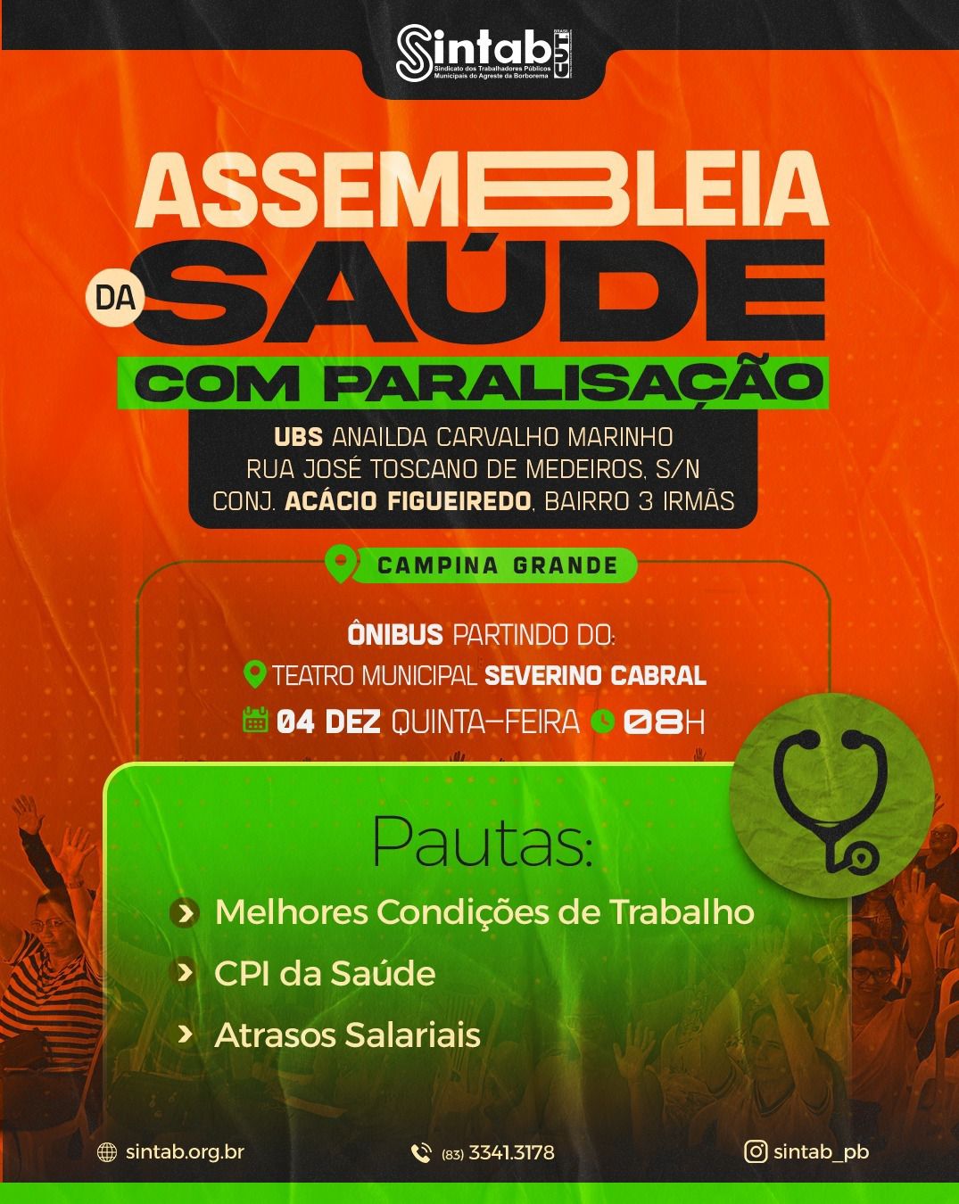 A paciência dos servidores da saúde de Campina Grande chegou ao limite. O SINTAB confirmou uma nova Assembleia com Paralisação para esta quinta-feira, 04 de dezembro, às 08h, e o clima é de revolta diante do que classificam como “o retrato oficial do abandono” na gestão municipal.