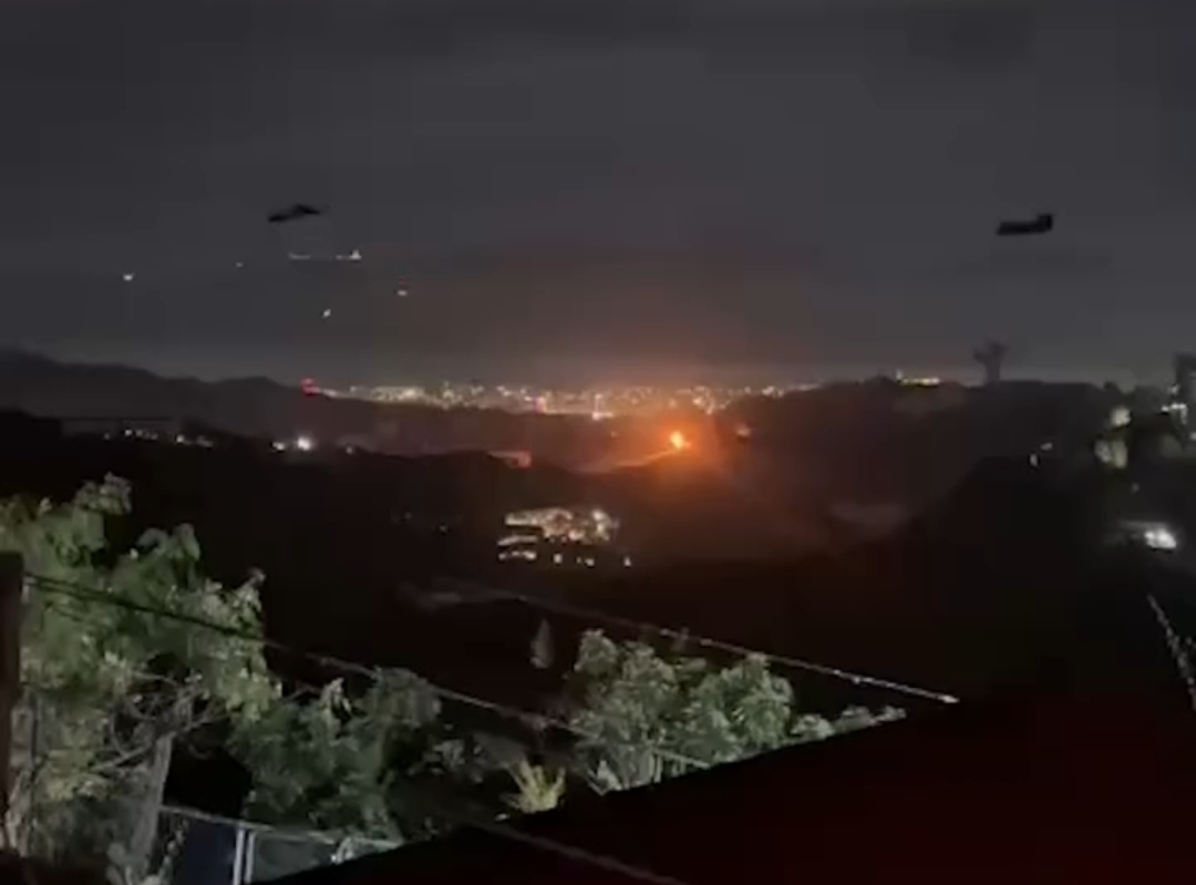 "Trump afirma que Maduro foi capturado em 'ataque de grande escala' à Venezuela. Vídeos mostram helicópteros sobrevoando Caracas com explosões ao fundo."