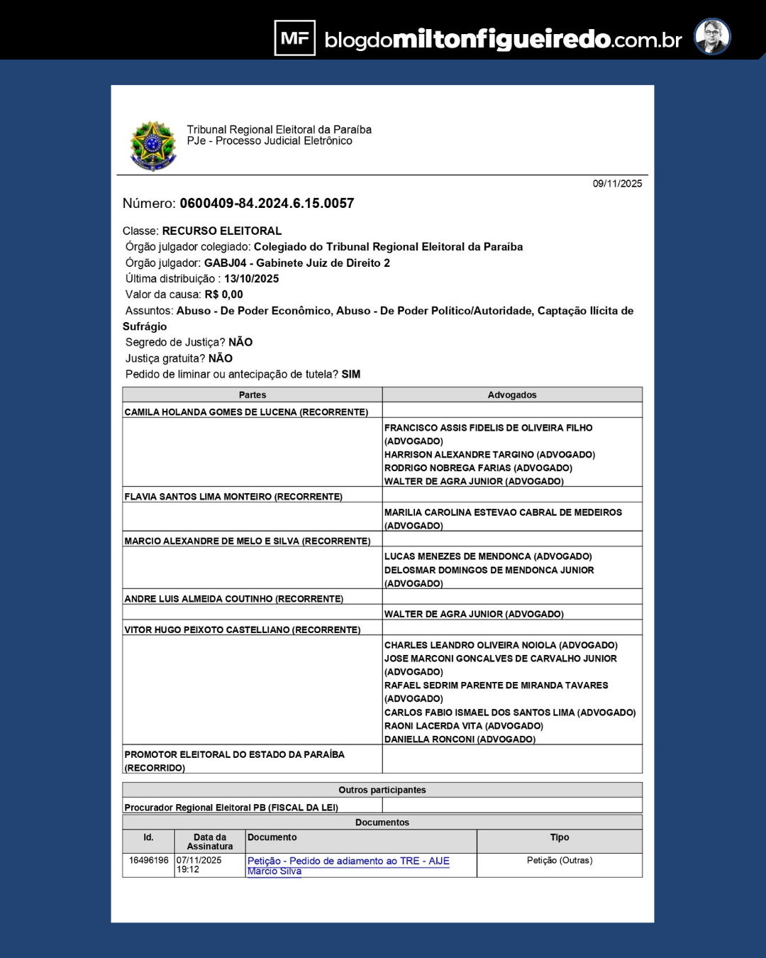 O recurso, protocolado neste domingo (9) no processo nº 0600409-84.2024.6.15.0057, é visto como uma jogada desesperada de um grupo político acuado. O objetivo é suspender a sessão marcada para esta segunda-feira (10), quando o TRE deve confirmar a cassação de Coutinho e de seus aliados, já punidos em primeira instância por abuso de poder econômico, político e compra de votos nas eleições de 2024.