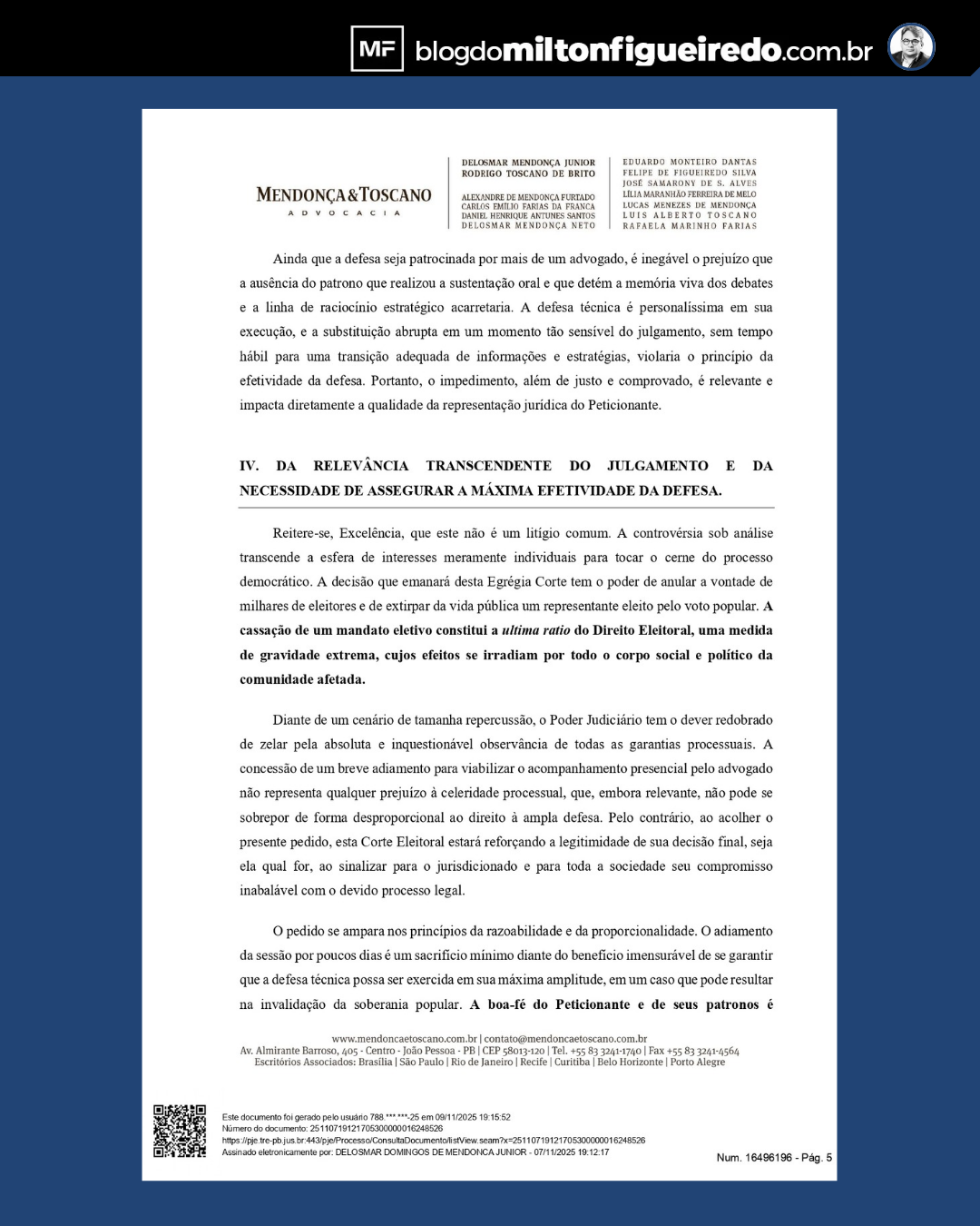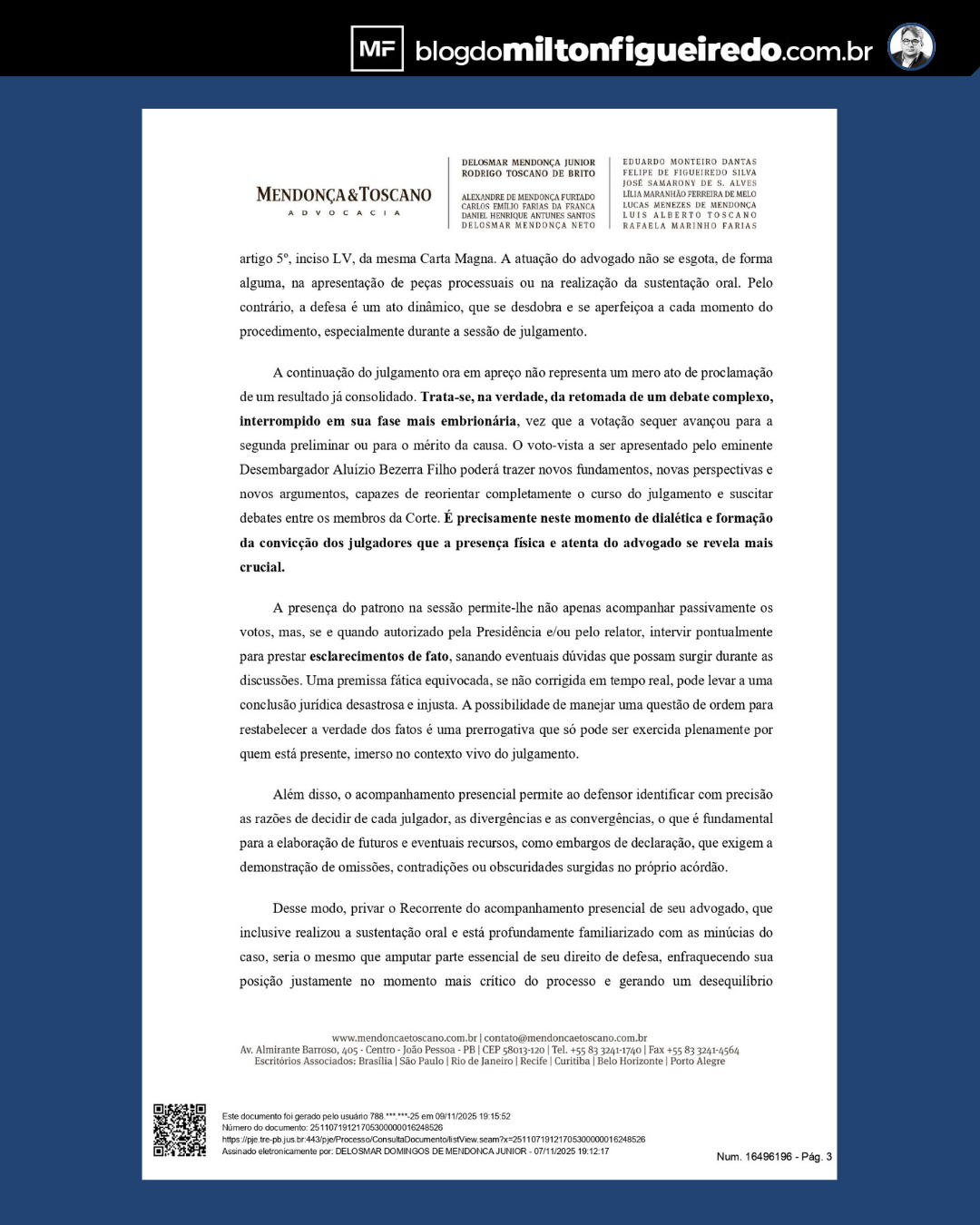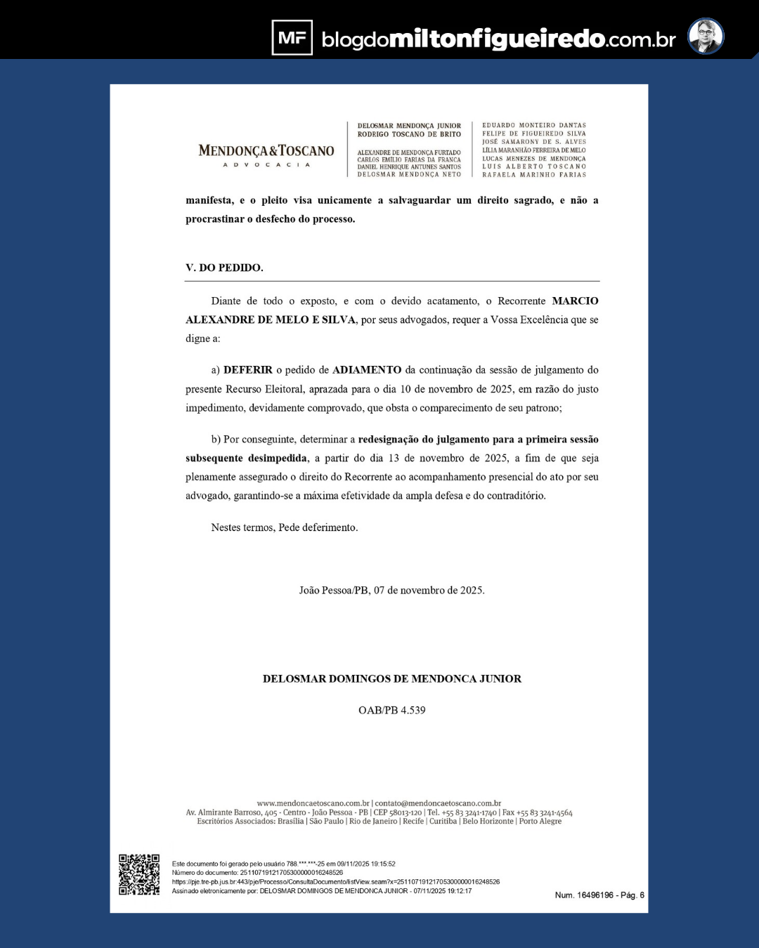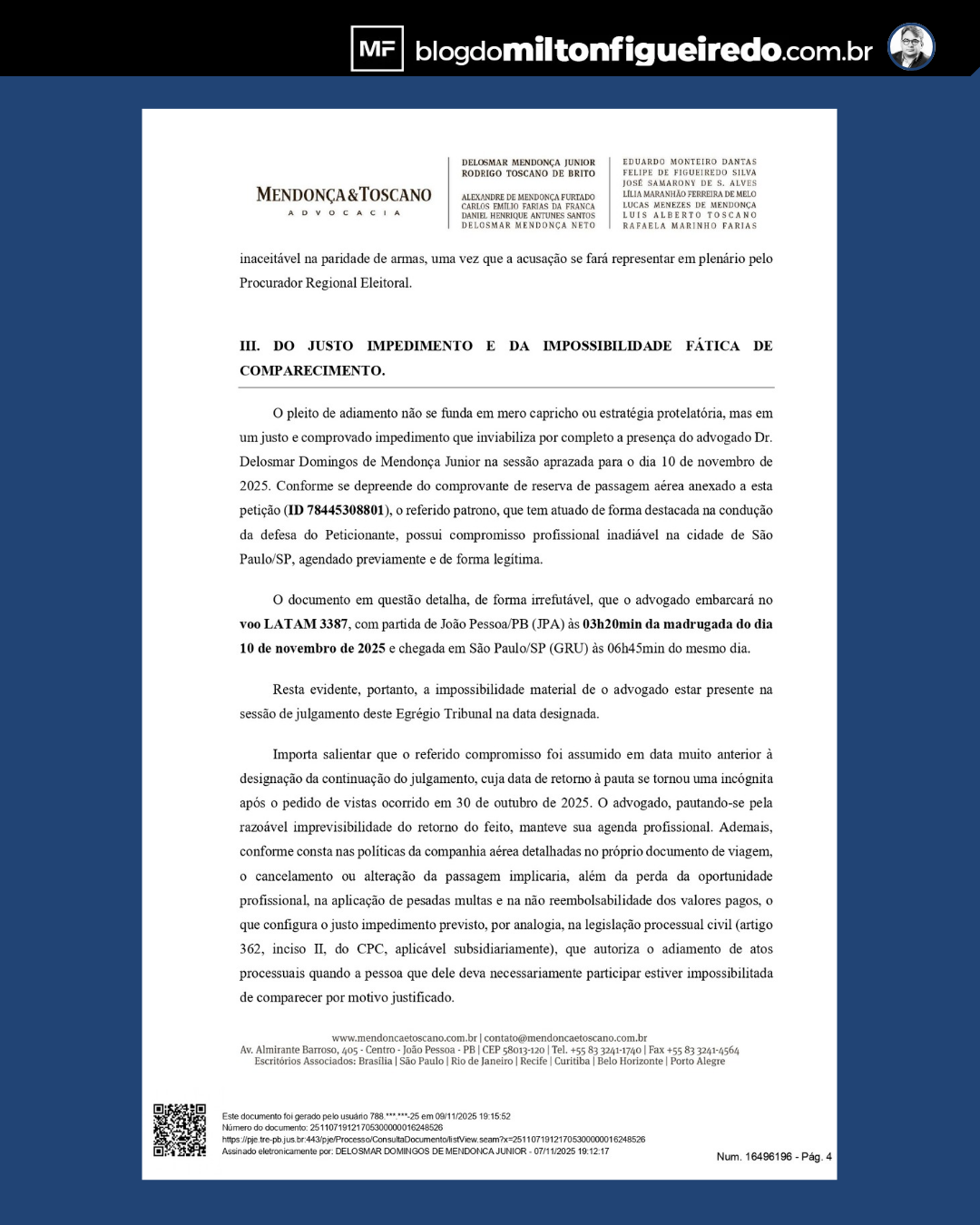 A defesa alega “justo impedimento” para o comparecimento de um dos advogados, argumento que, segundo fontes do Ministério Público Eleitoral, não se sustenta nem juridicamente, nem eticamente. Isso porque a banca é composta por vários advogados, e o processo vem sendo sucessivamente retardado pelos mesmos profissionais, numa estratégia de protelar o inevitável.