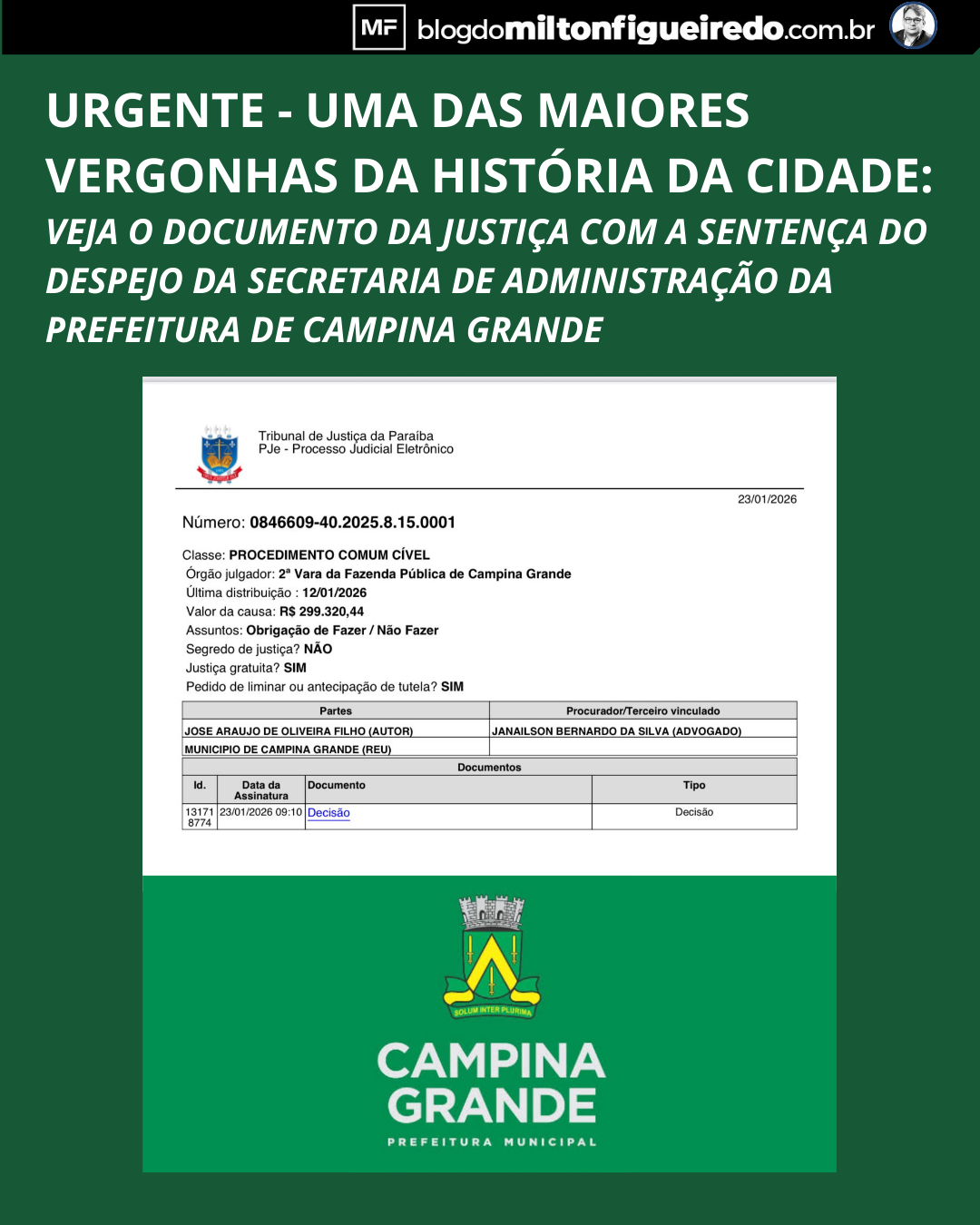 A decisão é da 2ª Vara da Fazenda Pública de Campina Grande, assinada pelo juiz Ruy Jander Teixeira da Rocha, no processo nº 0846609-40.2025.8.15.0001, e determina que o Município desocupe voluntariamente o imóvel localizado na Rua Irineu Joffily, nº 304, no Centro, no prazo máximo de 30 dias, sob pena de despejo forçado com apoio policial .