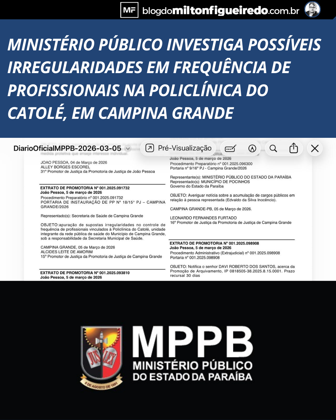 #CampinaGrande #MinisterioPublico #SaudePublica #Transparencia #PoliclinicaDoCatole #GestaoPublica #Paraiba #Investigacao #ServiçoPublico