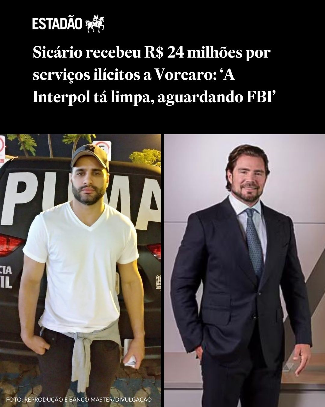 "A Polícia Federal revelou que o banqueiro Daniel Vorcaro pagou R$ 24 milhões a Luiz Phillipi Mourão, conhecido como "Sicário", por serviços ilícitos como invasão de sistemas e ameaças.